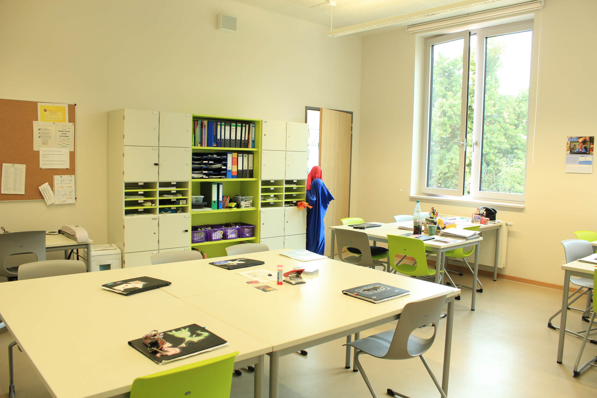 Hier bereiten eure Erzieher*innen die Angebote am Nachmittag und die Ferien für euch Hortkinder vor. Sie basteln, malen, schneiden aus, kopieren, führen Listen, gestalten Portfolios und schreiben Entwicklungsberichte.