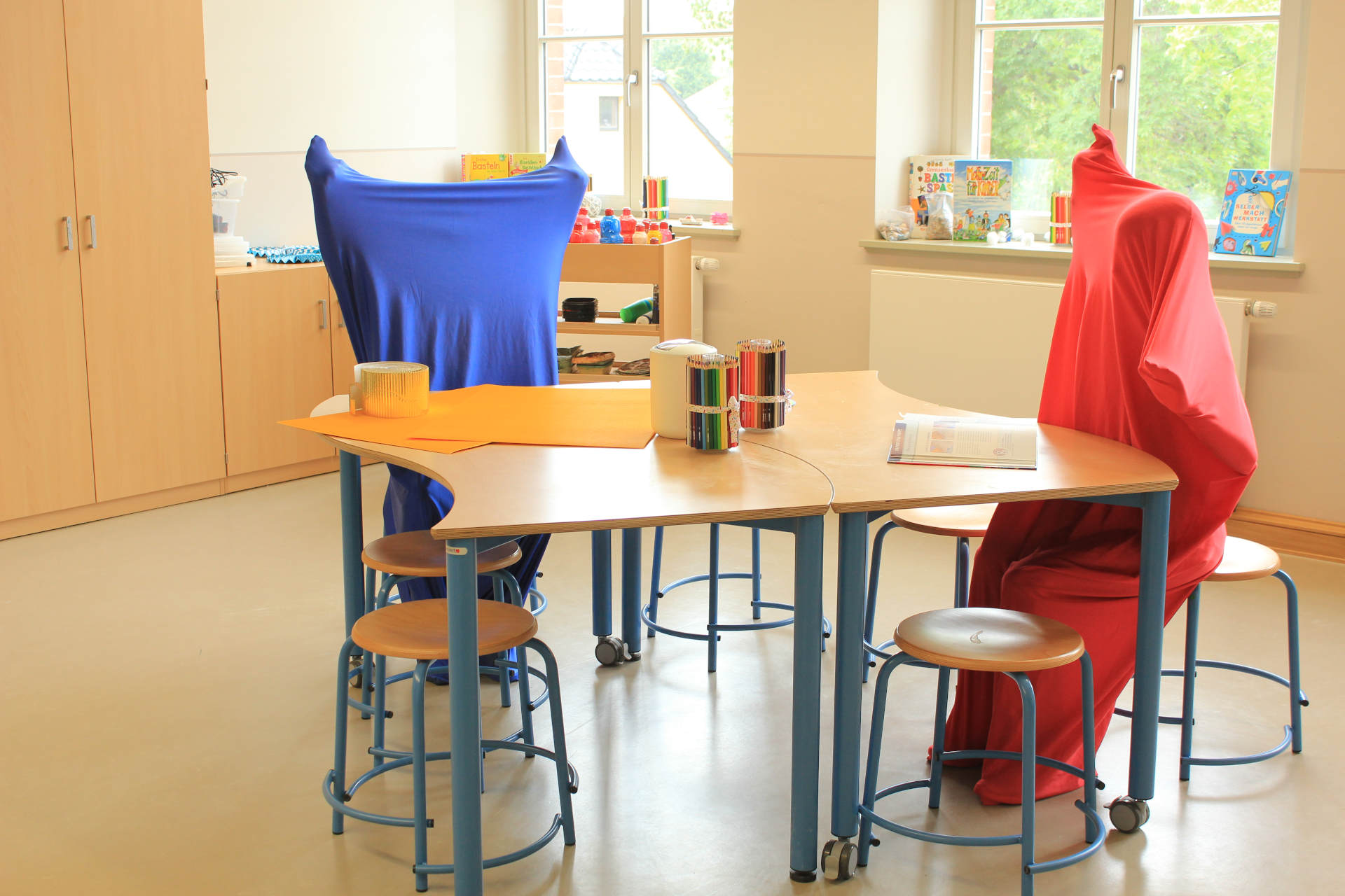 Im Kreativzimmer kann man viele schöne Sachen basteln und gestalten. Dort gibt es verschiedene Möglichkeiten, etwas Schönes zu kreieren. In diesem Zimmer kann man auch ein bisschen die Ruhe genießen. Das Highlight des Kreativzimmers ist, dass man alle Materialien frei benutzen kann. (Lina, 9 Jahre)