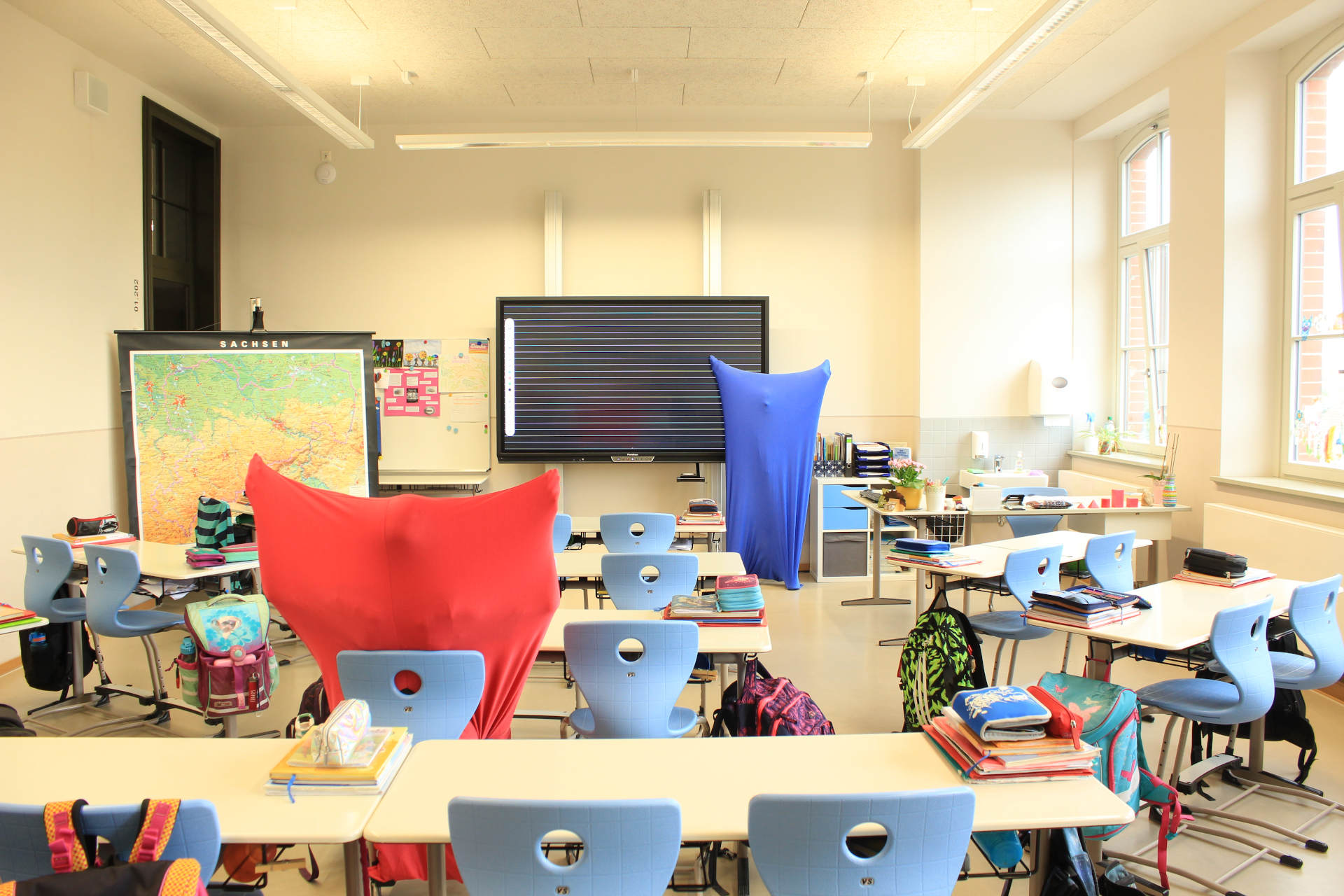Die Klassenzimmer sind die Räume, in denen unsere Schülerinnen und Schüler während des Tages die meiste Zeit verbringen. Alle Räume sind hell gestaltet und spiegeln die individuellen Vorlieben der darin beheimateten Klassen wieder. Neben klassischen Kreidetafeln stehen uns in vielen Räumen elektronische Tafeln zur Verfügung, die die Einbindung multimedialer Inhalte in den Unterricht ermöglichen. In allen Zimmern stehen den Schülerinnen und Schülern eigene Fächer zur Verfügung, in denen das benötigte Schulmaterial gelagert werden kann. Pinnwände und Bilderleisten bieten zudem ausreichend Platz für die kreative Gestaltung der Zimmer und das Ausstellen von Unterrichtsergebnissen.